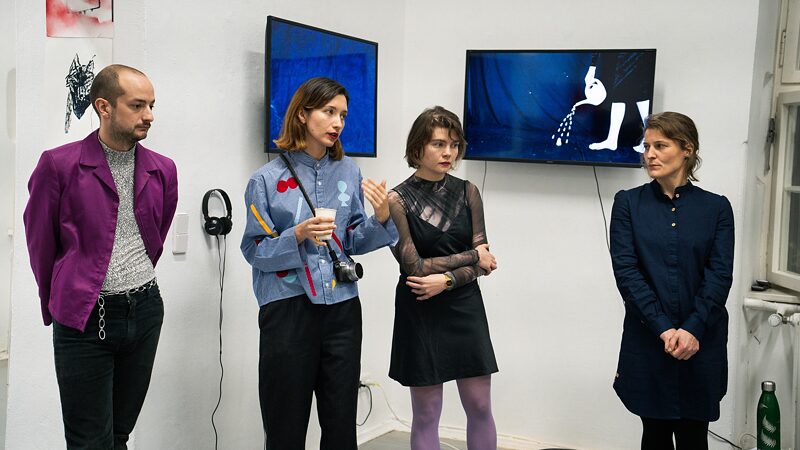Nach mehreren Monaten der Online-Zusammenarbeit hatten die Teilnehmenden des Online-Labors, das Kurator*innenteam, das Goethe-Institut Ukraine, Vitsche und Feminist Workshop die Möglichkeit, sich persönlich in Berlin für ein Networking und die Ausstellung zu treffen.