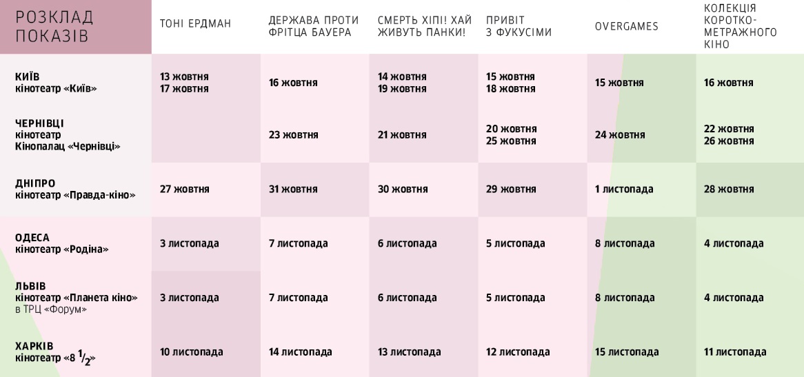 Goethe-Institut проводить в рамках «Тижнів Німеччини в Україні» фестиваль «Нове німецьке кіно». Українському глядачеві пропонується добірка найкращих повнометражних фільмів, що здобули в минулому році у Німеччині численні премії, а також колекція короткометражних стрічок, куди увійшли як дебюти режисерів-початківців, так і анімаційні стрічки відомих німецьких студій. У Києві також пройде ретроспектива короткометражних фільмів Сергія Лозниці – українського режисера, який з 2001 року мешкає в Берліні.