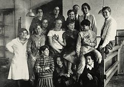 Gruppenfoto der Weberei-Klasse von Gunta Stölzl (mit Krawatte) um 1927