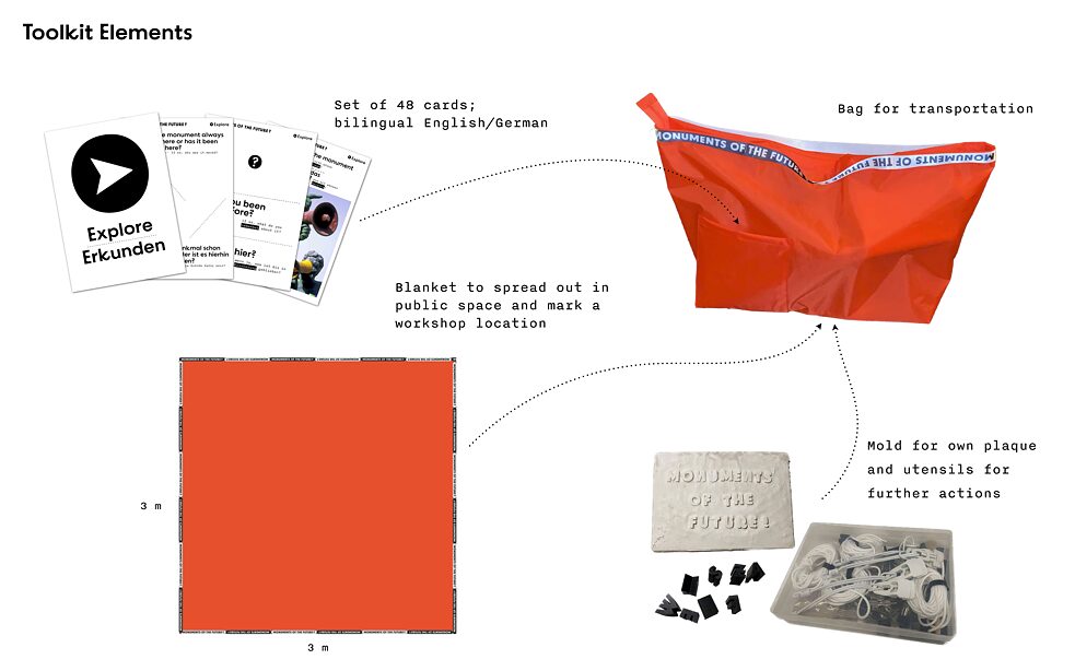 Die ‚Monumental Bag‘ enthält ein Toolkit, das junge Menschen dabei unterstützt, nicht nur ein Denkmal zu konzipieren, sondern auch den Entstehungsprozess eines Denkmals an sich. Indem sie ihren Nutzern*innen die Möglichkeit gibt, ihre Umgebung zu beobachten und sich ihr durch eine Vielzahl von Medien zu nähern, ermöglicht die ‚Monumental Bag’ eine kritische Reflexion von Gedenkkultur sowie die Identifizierung von Wahrnehmungs-Lücken im unmittelbaren Umfeld der Teilnehmenden.
