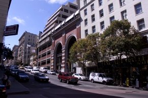 Derselbe Ort heute: das Goethe-Institut befindet sich im Gebäude mit beiden Arkaden (530 Bush Street).