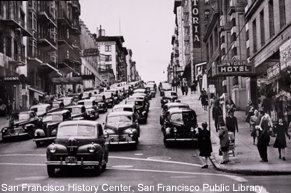 Stau auf Bush Street Ecke Grant um 1940. | San Francisco History Center, San Francisco Public Library