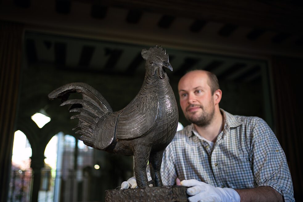 Archivar Robert Athol mit der Bronzestatue eines Hahns namens „Okukor“, einer der Benin-Bronzen, im Jesus College der Universität Cambridge. Die Statue wird nach dreijährigen Gesprächen an den Hof von Benin im Süden Nigerias zurückgegeben.