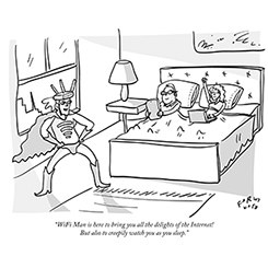 "WiFi Man is here to bring you all the delights of the Internet! But also to creepily watch you as you sleep." | © Farley Katz