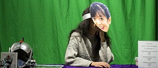 *Convention (2019/2025) restages a comic con-style autograph booth where the artist greets fans and sells signed headshots and photo ops relating to her past role as the Silver Power Ranger on the series Power Rangers RPM.