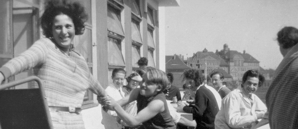 Gymnastics teacher Karla Grosch, who played a key role in the performances of the drama class, jokes with students on the terrace in front of the Bauhaus canteen