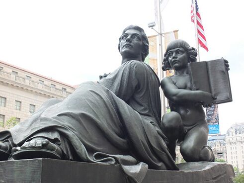 Weinman's monument to Straus includes a fountain (with the words "Statesman, Author, Diplomat") and two groups of statues, "Justice" and "Reason," each accompanied by inscriptions related to these virtues.