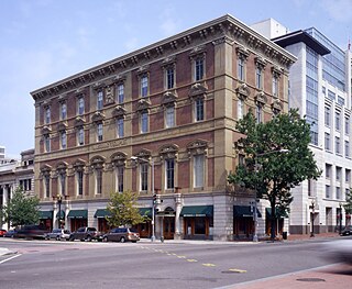 "The polychrome stone and cast-iron veneers applied to the brick walls of this Italian Renaissance palazzo offer some of the more eye-catching façades in town. When new, the building exemplified the mixed use of space so characteristic of late-19th-century, pre-zoning code urban architecture: shops jostled one another on the ground floor, and the Masonic Hall filled the space above. President Andrew Johnson, himself a loyal Freemason, laid the cornerstone and led the gala parade that celebrated the start of construction. In its prime the hall witnessed much Gilded Age gaiety: Washingtonians feted the Prince of Wales here in 1876 at a centennial banquet, and for decades society matrons fought for the honor of having their daughters' debutante parties here."