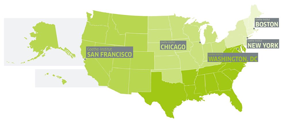 How can we assist you in building even stronger German programs? Do you have questions about how we support German programs (K – 16) in the US educational system? Check the map below to find out which Goethe-Institut serves your state and contact the persons-in-charge directly. We are here to help.