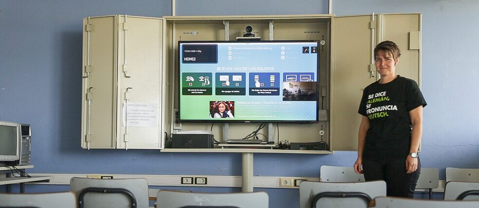 En Montevideo, Ignacio Dolio va a trabajar en scooter y llega en algunos pocos minutos. Sin embargo, su verdadero lugar de trabajo está a unos trescientos kilómetros de distancia, en el Liceo 3 de Fray Bentos. Lo que hace Ignacio es conectarse digitalmente desde el Liceo 34 de Montevideo con el alejado interior del país. Allí enseña alemán, y lo hace de modo online: la clase se transmite a una pantalla grande instalada en el aula de Fray Bentos. “Yo también tengo aquí una pantalla, conecto el micrófono y la notebook y ya tengo delante de mí a los alumnos.” Y, por supuesto, los alumnos también ven y oyen al profesor.