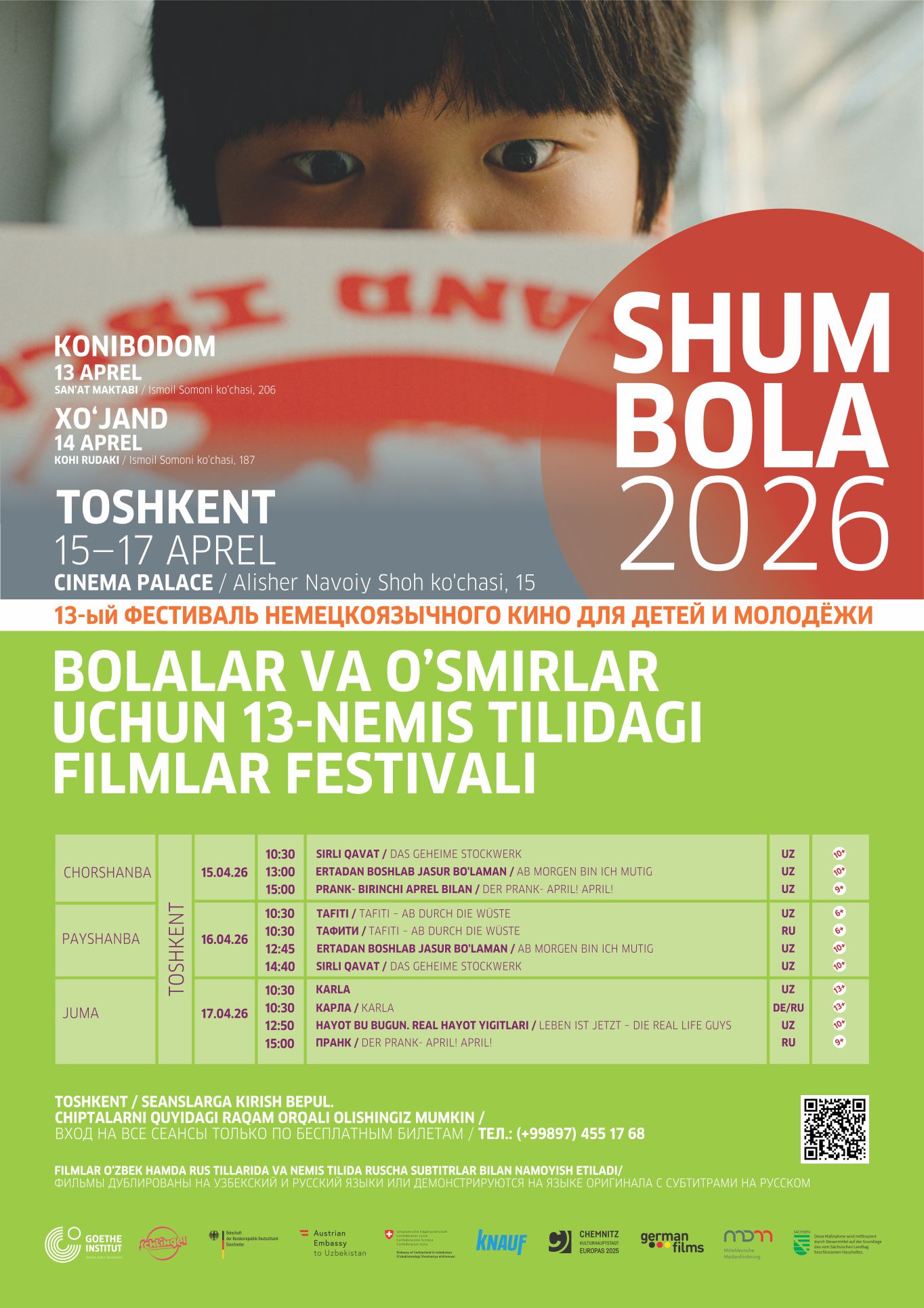 Dieses Jahr findet das Festival zunächst vom 13.-14.04. in Chudschand und Konibodom in Tadschikistan und anschließend vom 15.-17.04. in Taschkent, Usbekistan statt. Die Filme werden in usbekischer, russischer bzw. tadschikischer Sprache vorgeführt. Genauere Informationen zu Veranstaltungsorten und -zeiten können dem Programm entnommen werden. Das Festival lädt Kinder und Jugendliche dazu ein, inspirierende Geschichten zu entdecken, vielfältige Perspektiven kennenzulernen und die besondere Atmosphäre des Kinos zu erleben.