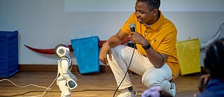 In the "Robot in Residence" project, the dark gray NAO 6, which stands about 60 centimeters tall and weighs just over fifteen kilograms. NAO is the sixth generation of the interactive humanoid robot NAO, developed by the Japanese-French company SoftBank Robotics. It is in use worldwide and serves primarily as a research object for educational institutions.