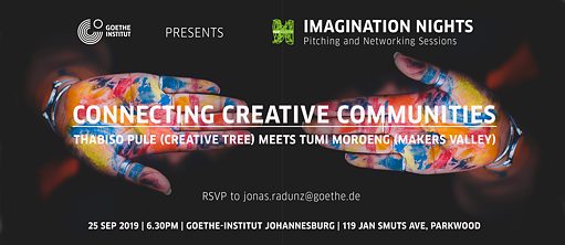 This time around, we focus on connecting people and spaces through creativity and dialogue. A trained dancer, Thabiso Pule is all about creating new interactive performance formats to engage with audiences. He will present his start-up Creative Tree and the ideas behind it. Accompanying him will be Tumi Moroeng, who represents the Makers Valley Collective – community group hoping to make a positive change in the Johannesburg area of Troyeville and the surrounding neighbourhoods through creative programmes.