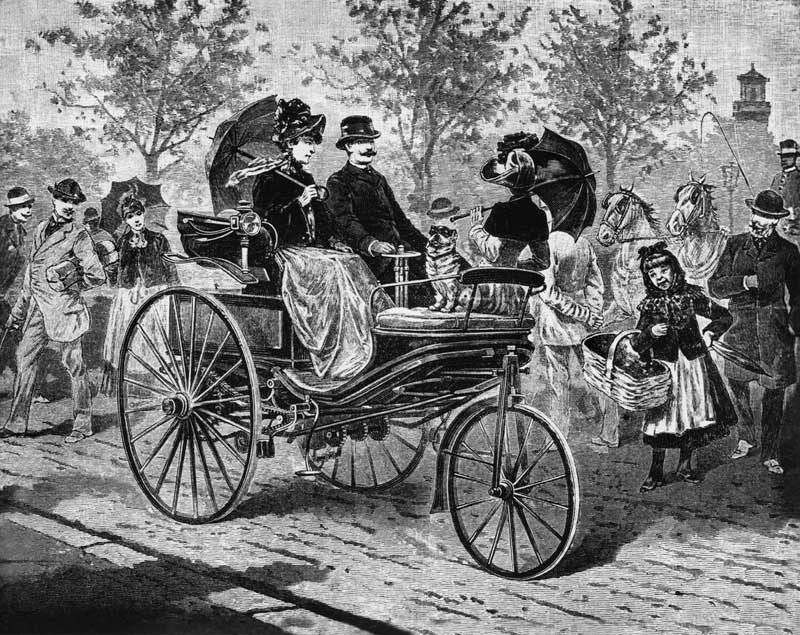 Das erste Auto fährt auf drei Rädern. Der 1886 von Carl Benz angemeldete Patent-Motorwagen Nummer 1 ist mit einem Verbrennungsmotor ausgestattet und damit der Urvater aller "Benziner". Die erste längere Fahrt damit unternimmt eine Frau: Anfang August 1888 fährt Bertha Benz von Mannheim nach Pforzheim und zurück.