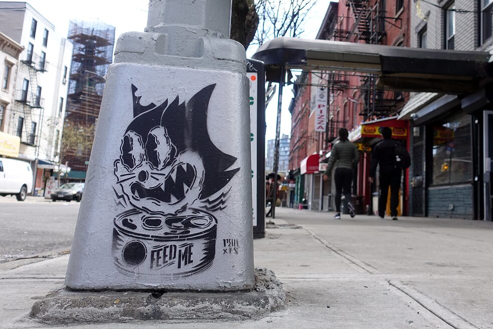 Tom y Jerry, la serie de animación más premiada del mundo. En esta obra, el artista callejero Praxis ha inmortalizado a un enfurecido gato Tom en una farola. Su petición de comida adquiere proporciones desesperadas. Sin duda, un comentario sobre la brecha social cada vez mayor.