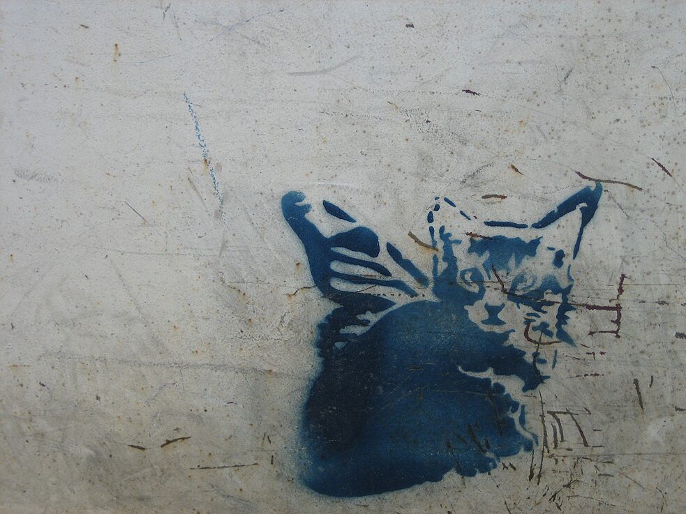 Desconocido, gato bebé sin nombre © Desconocido, Foto: Lunapark Para concluir nuestra serie de gatos, una hermosa imagen de esténcil de un gatito con las alas de una mariposa. Se desconoce su autor. ► Volver al primer gato Volver a "Gatos"