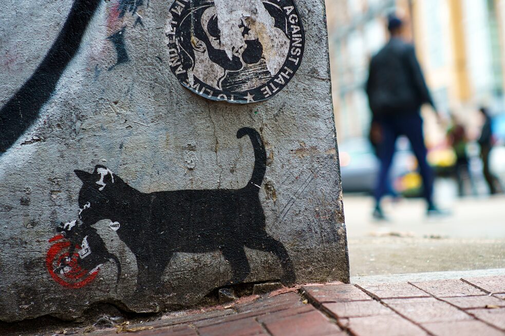 La souris a une puissance d’attraction certaine sur le chat. Qu'il s'agisse d'un cadeau pour le maître ou la maîtresse, d'un compagnon de jeu ou d'un petit snack entre deux, les savoureux rongeurs sont très appréciés dans le monde félin. Dans les œuvres de l'artiste autrichien de street art, Tabby, les chats ont souvent le rôle principal. Il est généralement accompagné d'une proie, bien qu'il s'agisse dans ce cas-ci d'une référence aux motifs de rats de Banksy. Pour éviter tout malentendu, ses œuvres portent des titres éloquents tels que