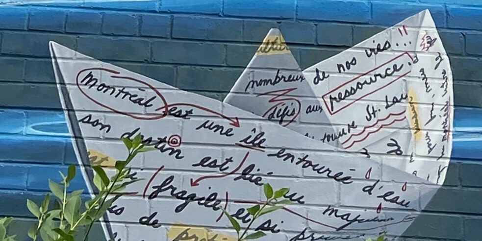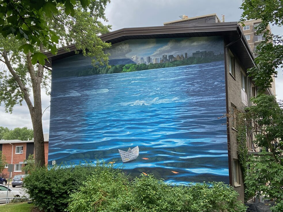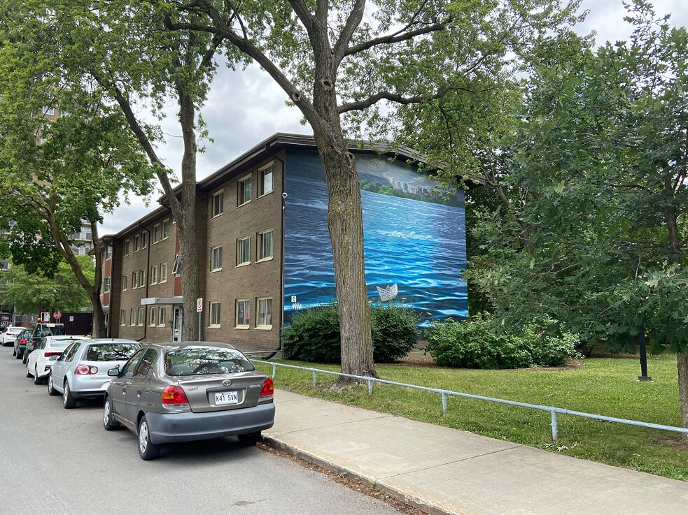 Le projet d’habitat social Habitations Jeanne-Mance se trouve au cœur de la vieille ville de Montreal, l’un des meilleurs emplacements immobiliers de la ville. Il s’agit du plus ancien projet de ce type au Canada et il héberge, au sein de 788 unités d’habitation, environ 1700 personnes venues de 70 pays différents dont beaucoup sont des réfugiés récemment arrivé.e.s. De nombreux murs appartenant à cet ensemble sont devenus des surfaces commissionnées par la ville et ses organisations de Street Art et qui traitent de thèmes importants pour les habitants et pour la cité.Avec Au fil de l’eau, il est évidemment question de l’élément aquatique qui a toujours été d’une importance capitale pour la ville insulaire de Montréal, traversée par le Saint-Laurent. Au Canada, pays qui dispose de plus de 9 % des réserves en eau douce de la Terre et dont le paysage est parsemé de plus de deux millions de lacs, cela n’a rien d’étonnant. Au Québec en tout cas, la distribution d’eau est incluse dans les impôts fonciers, ce qui veut dire que la consommation d’eau ne coûte rien. Par ailleurs, l’eau est utilisée pour la production d’énergie et elle contribue largement à l’indépendance du pays en matière d’importation énergétique. Toutefois, la distribution d’eau potable propre et douce n’est pas encore assurée dans tout le pays. Dans de nombreuses zones rurales et au sein de communautés indigènes, l’alimentation en eau ne fonctionne qu’avec les eaux du milieu naturel et les puits, ce qui n’est pas conseillé avec la pollution croissante de la nappe phréatique qui concerne aussi le Canada. Il y a encore beaucoup de choses à faire ici.