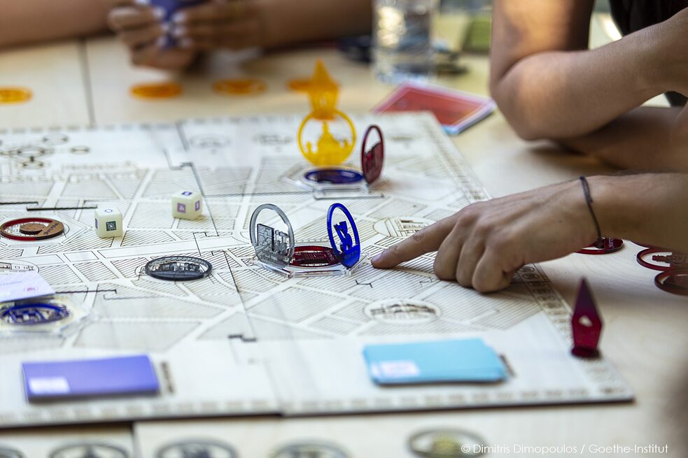 Vier Zweierteams in "Kampfposition": Fünf Mädchen und drei Jungen lachten und hörten aufmerksam zu, als einer von ihnen, Jannis, die Regeln erklärte. Sie schienen sich schon lange zu kennen. Doch nein. Georgia und Elias, Jannis und Marisa, Eleni und Manos sowie Melina und Maria saßen zufällig am selben Tisch. Sie hatten hauptsächlich über das Internet von dem Rollenspiel erfahren, das Infrastrukturen in ihrer Gemeinde, urbane Freiräume und den Dialog in der Stadt thematisiert und sie wollten dabei sein.