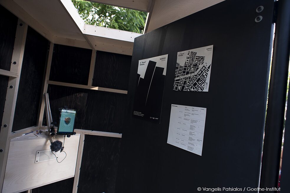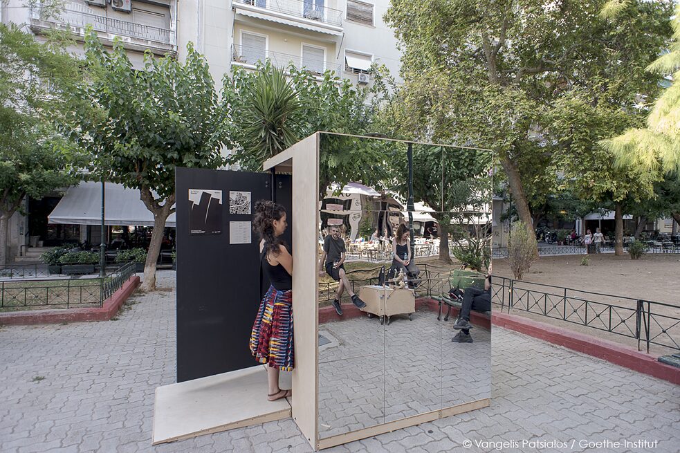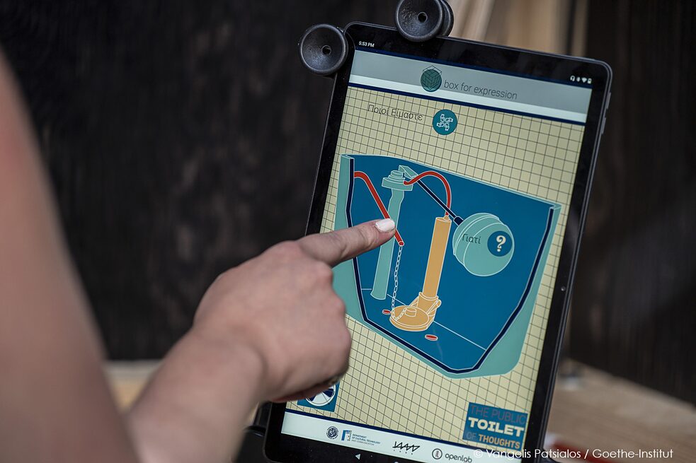 Während die vier Gruppen um die vorteilhafteste Nutzung des öffentlichen Raums für die örtliche Gemeinde "kämpften", standen ein paar Meter weiter drei Mädchen geduldig vor einer Kabine an, die - wenn sie anderswo und nicht mitten auf der Fokionos Negri gestanden hätte - eine Toilette hätte sein können. Als wir näherkamen, stellten wir fest, dass der erste Eindruck gar nicht so weit von der Realität entfernt war. Es handelte sich um das "Public Lavatory of Thought", ein Projekt, an dem drei Institutionen partnerschaftlich beteiligt sind: die Abteilung für Kulturtechnologie und Kommunikation der Ägäis- Universität, Open Lab Athens und Ludd. Auf dem Boden der Holzkabine stand ein Miniatur-Toilettenbecken aus Spiegelglas. Und weiter oben war ein Tablet angebracht, auf dem der Besucher spontan auf Fragen antworten und seine Antworten aufzeichnen oder sich einfach nur bereits gegebene Antworten anderer anhören konnte. Thematisch ging es dabei hauptsächlich um die Frage, wie sehr sich unser Leben durch die Isolation während der Pandemie verändert hat.