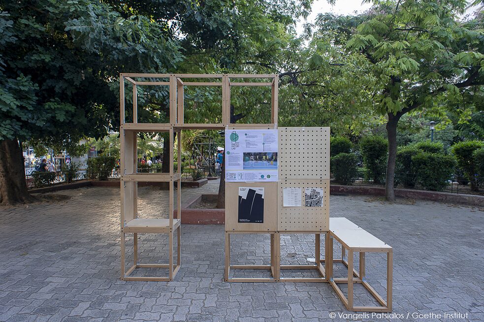 Auf dem Weg zum Kypseli-Platz legten wir noch einen Halt ein. Dort, wo wir auf die pädagogische Aktionsgruppe „Ap'Ousia" („abwesend-wesentlich“) trafen, die Bildungs- und Kulturprogramme für Jung und Alt konzipiert und durchführt. Sie machte sich gerade bereit, die Kinder zu empfangen, die sich angemeldet hatten, um ihr Viertel gemäß ihren Bedürfnissen und ihrer Fantasie neu zu konzipieren und ihr eigenes kollektives Modell der Fokionos Negri-Fußgängerzone aus recycelbaren und natürlichen Werkstoffen zu bauen.