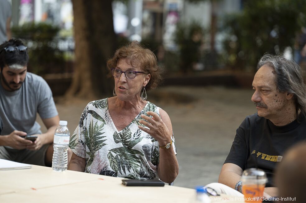 Als wir zu unserem Ausgangspunkt zurückkehrten, ging das Brettspiel seinem Ende entgegen und die Leute versammelten sich bereits, um an der geplanten Diskussionsrunde teilzunehmen. Geladen waren der Architekt, Aktivist und Professor an der Nationalen Technischen Universität Athen Stavros Stavridis, die emeritierte Professorin für Geographie und Europäische Kultur an der Offenen Universität Griechenlands Lila Leontidou, die Assistenzprofessorin an der Fakultät für Architektur der Universität Thessalien Iris Lykourgiotis und der Journalist Yannis Orestis Papadimitriou als Moderator.