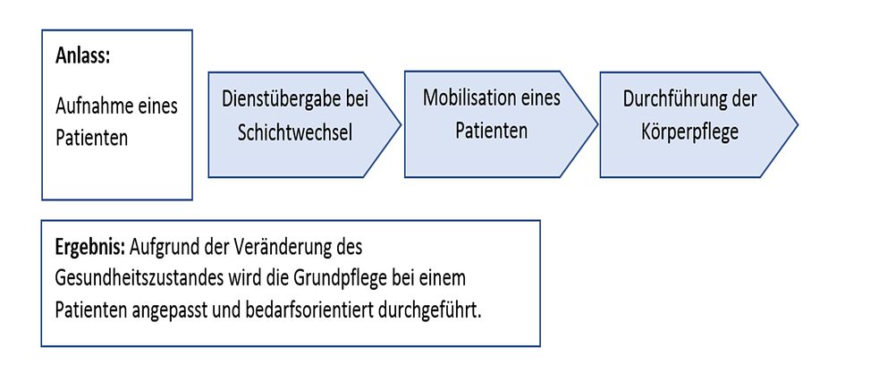 Relevant communication situations that can be linked together as action steps in logical process chains might for instance include recording patient history, drawing up a care plan, caring for patients: mobilisation, administering personal care (bedridden patients), issuing medicines, feeding, changing dressings; visits by health visitor and doctor, written documentation, handover.