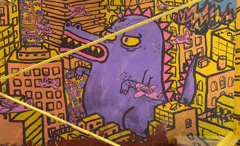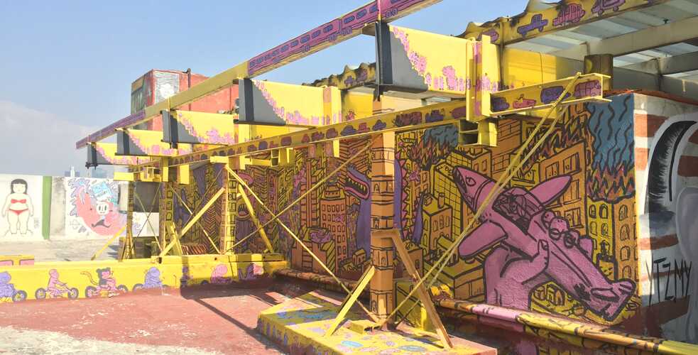 Einer der Teilnehmer war der Costaricaner Diego Fournier, der es zusammen mit dem Kollektiv Tres Zapotes übernahm, das Wandbild „Monsterstadt“ zu entwerfen. Die Mauerwand war mit mehreren Stützträgern und Rohren versehen, die das Werk inspirierten.