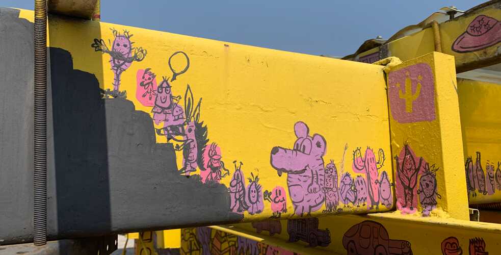 Der Spielzeugtempel in Mexiko-Stadt, das Museum für Altes Spielzeug Mexiko (MUJAM) präsentierte Ende 2017 seine Ausstellung Der letzte Pinselstrich des Jahres (La última pinta del año). Dafür rief es Straßenkünstler wie Ani Kim, Pispopstore, Citlaliun Arcos und Romina Becker zusammen, um die Mauerwände seiner Dachterrasse zu gestalten.Mir gefällt, dass die Farben und Mexiko-Stadt das Szenarium dieser Geschichte sind.