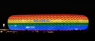 Das Eröffnungsspiel der EM 2024 findet in der Arena in München statt. Ihr Markenzeichen: die berühmte Luftkissenfassade aus fast 3.000 Folienkissen, die beleuchtet werden kann. Zu Spielen des FC Bayern strahlt sie in Rot, zu Länderspielen in den Farben der deutschen Flagge. Es ist eine der größten LED-Fassaden der Welt. Bei der letzten Männer-EM 2021 sollte die Arena beim Spiel Deutschland gegen Ungarn in Regenbogenfarben leuchten, um ein Zeichen gegen die queerfeindliche Politik in Ungarn zu setzen. Der Verband UEFA – die Union der Europäischen Fußballverbände – verbot dies jedoch mit der Begründung politischer Neutralität. Die Münchner Arena ist das Heimstadion der Männer und bei Highlightspielen auch der Frauen des FC Bayern.