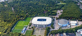 Der Name ist Programm: Das Volksparkstadion liegt mitten im Grünen – im Hamburger Volkspark. | Foto (Detail): © picture alliance/ZB/euroluftbild.de/Martin Elsen