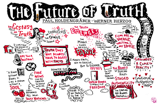 Visual notes and graphic recording by Silent James of Paul Holdengräber and Werner Herzog’s discussion about “The Future of Truth” at the Thomas Mann House conference “Arts in Times of Crises — The Role of Artists in Weakened Democracies” | ©Thomas Mann House / Visual Notes by Silent James