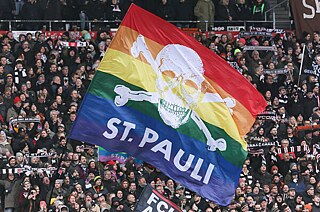 St. Pauli Fans mit Regenbogenfahne im Millerntorstadion nahe der Hamburger Reeperbahn im Februar 2024 | Foto (Detail): © picture alliance / Selim Sudheimer | Selim Sudheimer