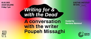 Begleiten Sie uns zu einer Lesenacht mit der Autorin. Missaghi wird Auszüge aus dem Buch lesen und sich mit der Künstlerin und Schriftstellerin Mandana Mansouri unterhalten. Im Mittelpunkt des Gesprächs steht das Schreiben in Krisenzeiten: Was bedeutet es, zu schreiben, wenn man tagtäglich Gewalt sieht und erfährt, und welche ethischen Möglichkeiten des Schreibens gibt es?