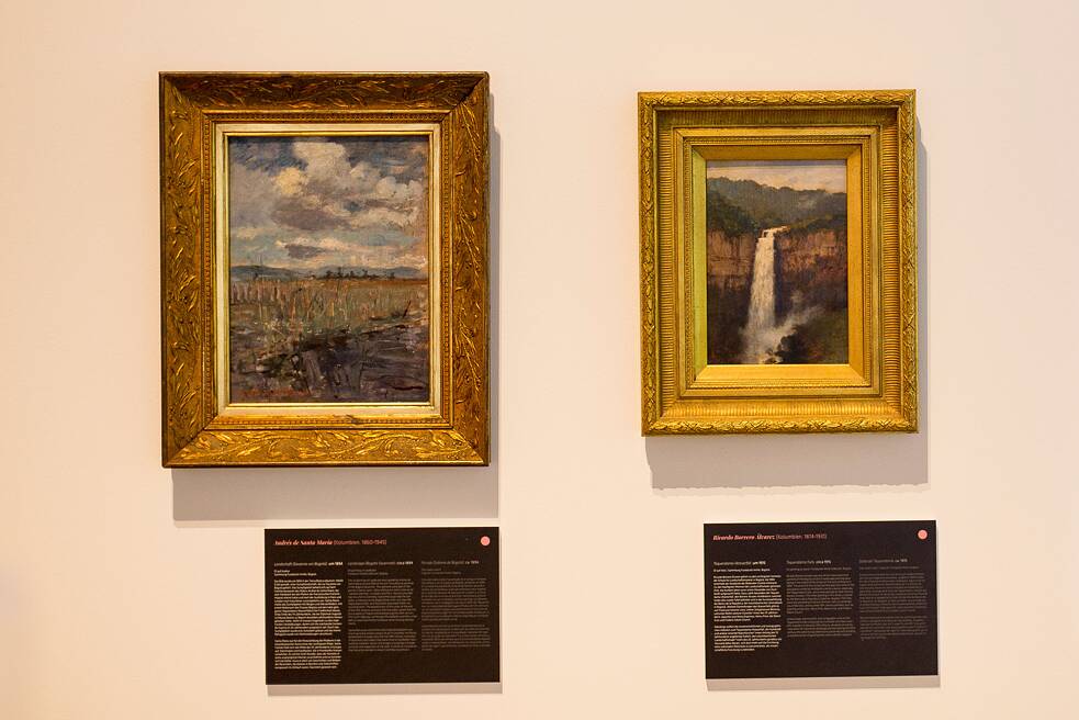 Links: Andrés de Santa María, Landschaft (Savanne von Bogotá). Rechts: Ricardo Borrero Álvarez, Tequendama-Wasserfall. Die Natur der Dinge: Humboldt, Kommen und Gehen. Humboldt Forum, Berlin, 2019. | Foto: Viktoria Tomaschko