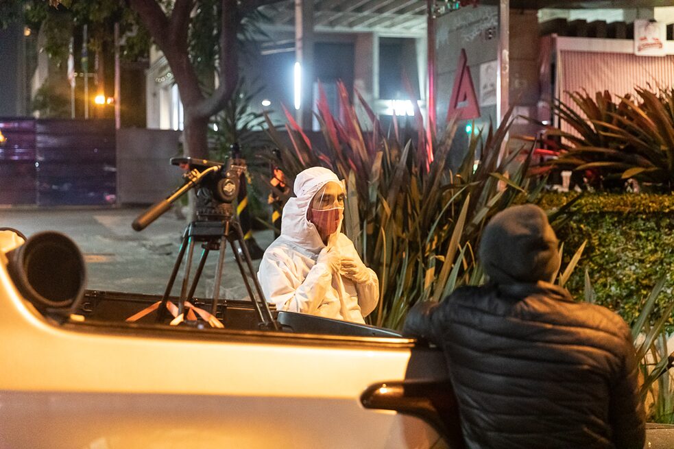 A inspiração veio da obra Experiência nº 2, do artista Flávio de Carvalho. No início da década de 1930, ele resolveu caminhar em direção contrária a uma procissão religiosa e quase foi linchado pela população. Eu, Antonio e os atores do Teatro Vertigem ficamos na rua, com roupas e equipamentos de proteção, para ajudar os motoristas a manobrarem os carros. Foi uma vitória conseguir fazer essa performance ao vivo. Eu nunca tinha trabalhado com o Vertigem e, mesmo em condição de isolamento, com nossas reuniões de trabalho acontecendo de forma virtual, foi uma experiência forte, intensa, olho no olho.