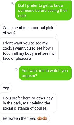 Ještě znepokojivější než větší míra úchyláren je počet lidí, kteří nedbají na vládní doporučení a navrhují osobní setkání (vždycky kvůli po sexu). Když jsem se jednoho takového muže jménem Mark zeptala, jestli dodržuje odstup, odvětil: „Jo, ale musíme se pobavit.“ Další uživatel si podle všeho myslel, že se setkat můžeme, pokud zůstaneme uvnitř, na což jsem odpověděla několika odkazy na články o tom, jak se chránit.