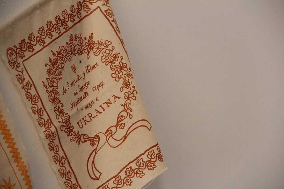 Teťany něžně přebírají kousky – vyšité, pletené, háčkované, tkané – a zmiňují místa, odkud jim je lidé poslali. „Tenhle je z Oděsy, tyhle dva z Kyjeva, od našich maminek z podpůrných skupin. Tyhle máme z Užhorodu, od ženy, která čeká, až se z války vrátí její bratr, mají spolu výjimečné pouto. Tenhle je z Ternopilské oblasti a tenhle z Tokmanivky,“ vypráví. Účastnice projektu Spříznění zobrazují na svých kouscích do plátna příběhů velmi rozmanité věci. Mezi časté motivy patří vlajka, státní znak, květiny, které pro tyto lidi něco znamenají. Některé také připomínají maskovací síť. Vytvořila je maminka vojáka, která už téměř dva roky dobrovolničí: kupuje v second handech oblečení, aby ho mohla rozstříhat na proužky určité barvy a uplést z nich maskovací sítě.