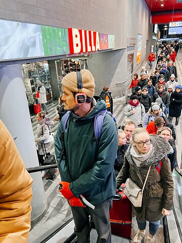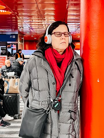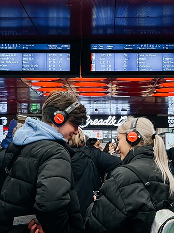 Im allgemeinen Trubel fällt mein Blick auf eine kleine Gruppe von Menschen, die sich neben einem Stand mit der Aufschrift „Städtische Theater Prag“ versammelt hat. Offensichtlich handelt es sich um Leute, die es nicht eilig haben. Sie stehen zu zweit oder vereinzelt, und gerade weil sie nirgendwohin streben, ziehen sie die Aufmerksamkeit der Passant*innen auf sich. Eine Performance scheint unmittelbar bevorzustehen. Ich schließe mich der Gruppe an. Wir werden dazu angehalten, Kopfhörer aufzusetzen. Es ist der Beginn einer mentalen Reise…Schon mit den ersten Klängen beginnt sich die als bekannt empfundene Realität zu verändern und von einem zu entfernen. In diesem „Stück“ gibt es keine Schauspieler*innen wie im Theater. Nur die Stimmen der Protagonist*innen sind über die Kopfhörer zu vernehmen. Deren Worte und Sätze könnten jeder Passantin, jedem Passanten gehören, die sich da auf dem Bahnsteig drängen. Satz für Satz entfaltet sich die Geschichte, und man wird unmerklich in sie hineingezogen.