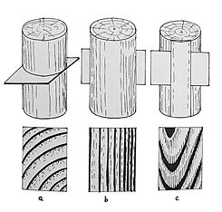 Schnitte durch Holz – a) Querschnitt, b) radial, c) tangential