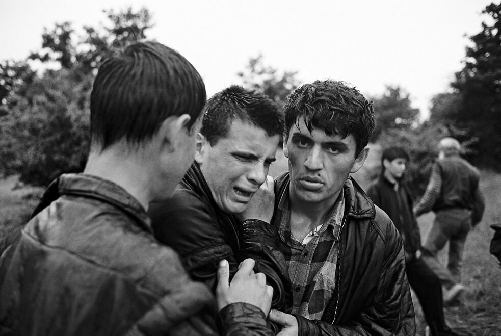 Das Foto entstand im Juni 1999. Ich war kurz nach dem Krieg in den Kosovo gereist, als noch serbische Einheiten, gleichzeitig aber schon westliche und russische Truppen dort waren. Das Foto, das du meinst, zeigt einen jungen Mann, dessen Vater von einer Mine getötet wurde. Die Szene wurde bei der Beerdigung aufgenommen. Natürlich gab es da starke Emotionen. Ich war ungefähr ein oder zwei Stunden dort gewesen, hatte schon mehrere Bilder gemacht. Dann drückte ich den Auslöser, als der Mann anfing zu weinen. Er weint und gleichzeitig sieht er mich mit einem sehr bösen Blick an. Er verflucht mich buchstäblich. Er wird auf beiden Seiten von seinen Freunden gestützt. Die Frage, ob ich hier nicht zu weit gegangen bin oder eine Grenze überschritten habe, ist sicherlich berechtigt. Gleichzeitig weiß ich, dass hier ein äußerst suggestives, starkes Foto entstanden ist. Ich denke, dass ich den Mann nicht auf irgendeine Art und Weise entwürdigt habe. Das ist mein Kriterium. Für mich als Fotograf wäre eine Grenze überschritten, wenn durch mich die Würde der fotografierten Person verletzt wird.
