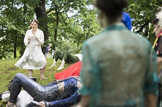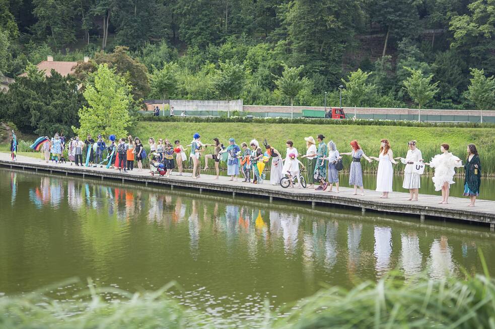 Den Workshop beginnen wir am nächsten Tag in den Dachgeschoss-Räumlichkeiten des Ateliers Nová média II mit einem gemeinsamen Kreis. Die Teilnehmenden kommen auch aus Österreich, der Slowakei und aus Polen, es sind insgesamt an die vierzig Personen. Uns wird das Ecosex Manifesto vorgestellt. Wir stimmen uns mit Bewegung ein, atmen in einem Rhythmus, nennen unsere Namen und unsere ökosexuellen Namen und teilen unsere süßen und herzhaften Pausensnacks miteinander, bevor wir in Gruppen eingeteilt werden, in denen wir uns auf einen performativen Spaziergang durch den Stromovka-Park vorbereiten sollen. Wir gehen durch den Park, als hätten wir ein Stelldichein auch mit den Bäumen, als wäre das ganz alltäglich, gehöre zum Schaum der Tage dazu und wäre zugleich eine Kunstform, eine rituelle Verbindung aller drei Elemente.Unsere Gruppe ist heterogen, letztendlich kommen alle diejenigen dazu, die gerade nicht aufgepasst haben, als die Gruppeneinteilung vorgenommen wurde; die anderen fangen erst am nächsten Tag an. Wir versuchen, unsere Ideen für den Spaziergang auf ein großes Blatt Papier zu schreiben. Ich bemühe mich, alle meine Moderationsfähigkeiten zu aktivieren, doch das klappt nicht besonders, am nächsten Tag werde ich in der Morgenrunde sagen, ich hätte von den Seelen zweier Frauen geträumt, die keine ausreichend gute Arbeit hätten, was ihnen ihre Familie vorwerfe.