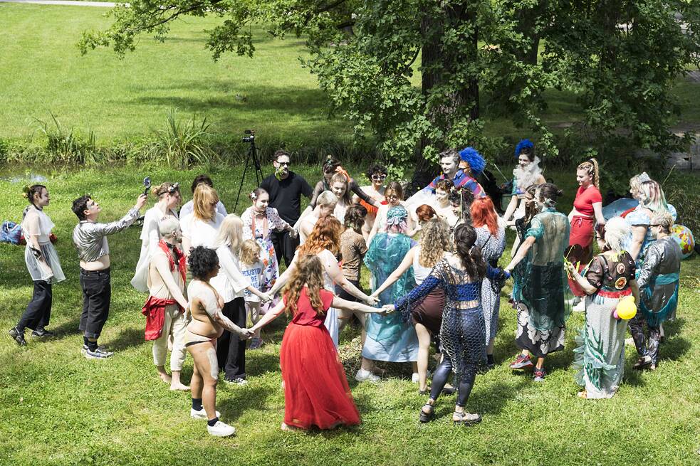 Die Performance am nächsten Tag ist wie eine Auferstehung. Alle tragen schöne bunte Kleidung, sind gelockert, glänzen, irgendwie ordnen wir uns dem Ereignis unter, die Konflikte des vergangenen Tages lösen sich auf. Die Rituale lassen sich nicht nur queer machen, sondern stellen darüber hinaus eine allen zugängliche Plattform dar, in der wir einen Platz finden können, die eine eigene, von uns oder von anderen Leuten unabhängige Kraft besitzt. Und die verbunden ist mit dem Ganzen, nicht nur mit dem Ganzen unserer zerstrittenen Gruppe. Es ist wirklich schön, wir gehen mit dem Wasserlauf, werfen alte Leiden ab und verbrennen sie im Feuer.Charon bringt uns in die Mitte der Moldauinsel Štvanice, wo wir ein Feuer aus ineinander verschlungenen Körpern, den Tanz mehrerer und dann wiederum zweier Menschen betrachten. Wir lehnen uns gegen Bäume und aneinander an. Da lege ich mich auf den Boden, die Arme lege ich über mich, lasse alles abfließen. Annie Sprinkle kommt zu mir, fotografiert mich und sagt, das sei schön. Ja, Mädchen, endlich hast du dich zu Boden geworfen, jedem hier war klar, dass du das mehr brauchst als wieder die Wichtige zu spielen.