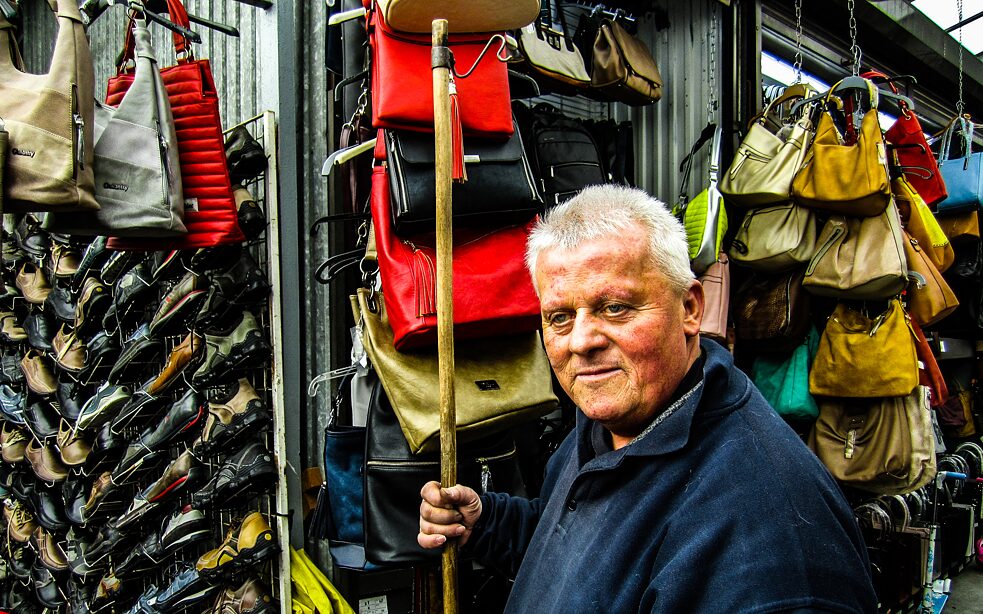 Auf seinem Sweatshirt steht „Freiwillige Feuerwehr“ und mit seinen polnischen Kollegen vom Stand nebenan spricht er abwechselnd slowakisch, tschechisch und polnisch. Herr Mirek verkauft hier auf dem Markt schon seit gut zwanzig Jahren Schuhe und Taschen. „Ich bin aus Prag. Was ich hier tue? Da ist die reinste Überflutung, aus der ganzen Welt, also bin ich abgehauen.“ Wir unterhalten uns über die komplizierten tschechisch-polnisch-slowakischen Beziehungen. „My was kochamy!“ („Wir lieben euch!“) ruft mir eine Verkäuferin vom Nachbarstand zu. Nationalitäten hin oder her – komplizierter ist es zwischen den einzelnen Menschen, sagt auch Mirek. „Ich hab dort wirklich gute Beziehungen, Freunde. Jasiu – ein super Kerl“, er zeigt auf den Kollegen, der ebenfalls Schuhe verkauft. „Idioten findest du überall und überall findest du gute Menschen. Den Idioten weiche ich aus, und Jasiu ist der Beste. Ich bin hier seit zwanzig Jahren. Aber Jasiu – von diesen normalen Polen gibt es nur wenige. Er ist beste Schuster.“