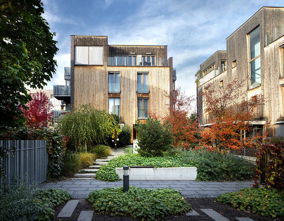 Außerdem kann auch die bewusste Gestaltung von halböffentlichen Räumen, das heißt von Räumen, die nur für die Bewohner*innen des Viertels bestimmt sind, sinnvoll sein. Ein Projekt, das mit gemeinsam genutzten Räumen arbeitet, ist das Wohnhauskomplex Vackov des Architekturbüros UNIT architekti. Abgesehen von der Nähe der Gebäudeeinheiten zueinander gibt es hier auch Entwürfe für Gemeinschaftsräume, in denen man gemeinsam Zeit verbringen kann und einen halb-öffentlichen Platz. Auch wenn beides nicht zu 100 Prozent so funktioniert, wie die Architekten es sich vorgestellt haben, ist diese Option für immer für diejenigen angelegt, die sich treffen wollen – und außerdem ist es eine optisch sehr ansprechende und gemütliche Umgebung. Diese Nähe und die Möglichkeit, Freundschaften zu schließen, haben natürlich auch ihre Kehrseite. Zum Beispiel wenn sich jemand bis spät in die Nacht in seinem Vorgarten unterhält und man nicht einschlafen kann, weil man jedes Wort verstehen kann.