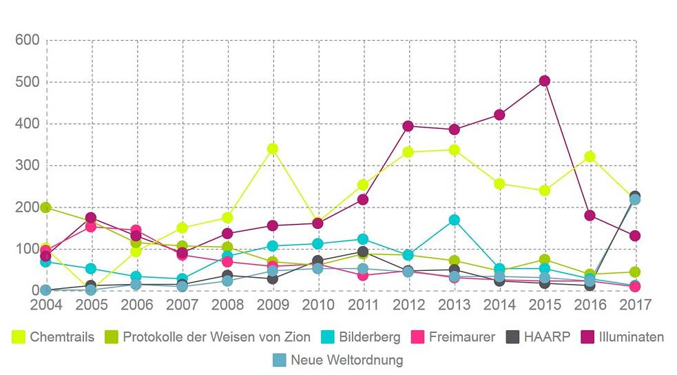 Die Anzahl der medialen Auftritte zum Thema klassischer Verschwörungstheorien hat sich während der letzten zehn Jahre verdoppelt. Über 95 Prozent davon entfallen auf das Internet.