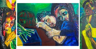 Marushkas Triptychen Frauen im Krieg entstanden zwischen 2016 und 2017. Sie sind eine künstlerische Reaktion auf die ersten Jahre des russischen Krieges in der Ostukraine, als täglich neue Todesnachrichten eintrafen und sich die Bilder von Beerdigungen tief in das kollektive Gedächtnis einbrannten.Die unzähligen Fotos von Frauen, die ihre im Krieg gefallenen Männer, Brüder und Söhne zu Grabe tragen, haben bei Marushka einen tiefen Eindruck hinterlassen und sie zu den Triptychen Frauen im Krieg animiert.
