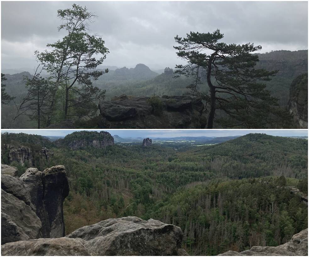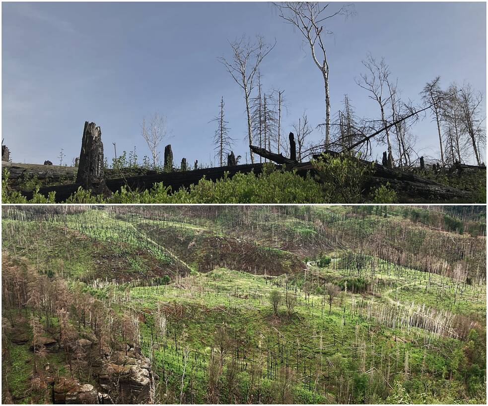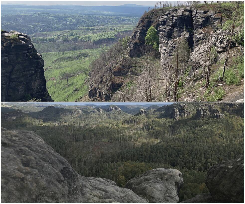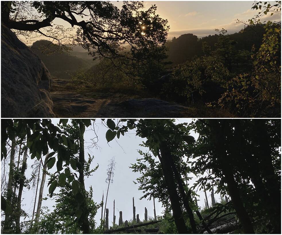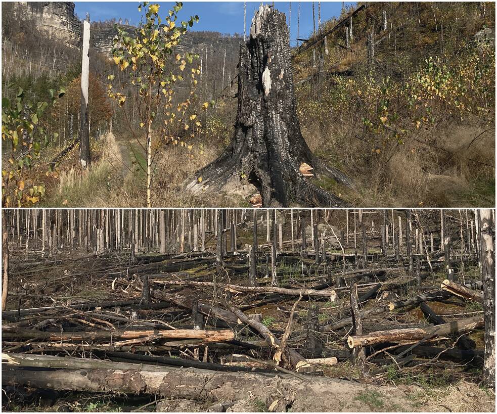 Auch Forstwirtschaft gab es seit Jahrhunderten − eine Tradition allerdings, die durch ihre Nadelholz-Monokulturen schon einmal in den 1920er Jahren zu großer Waldzerstörung durch den Nonnenfalter in der Sächsischen und Böhmischen Schweiz führte. Die danach angepflanzten Fichten haben nun die Dürresommer seit 2018 nicht mehr ausgehalten, der Borkenkäfer nutzte die Schwäche. Seitdem bricht der Wald zusammen, es entstehen „Mikado“-Felder aus Totholz. Besucher*innen beklagen das traurige Antlitz des Waldes. Anwohner*innen fürchten, dieses Totholz könne Waldbrände anfachen, wie den dramatischen Flächenbrand im Sommer 2022.
