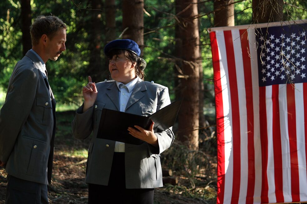 Szene aus einer der Theaterwanderungen „Fingierte Grenzen“ über die Operation Kámen
