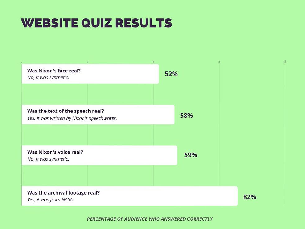 The data also hints at a question we asked ourselves throughout the project: could the impact of the project be harmful? Could we inadvertently trick our audiences? Were we adding to moon landing conspiracy theories? And is it ethical to try to manipulate people into believing something that isn't true even if you reveal your motives and methods after the fact?Perhaps it was in the semantics - if we called our piece a work of "synthetic media" instead of a "deepfake", could we switch from being a problem to being part of the solution?